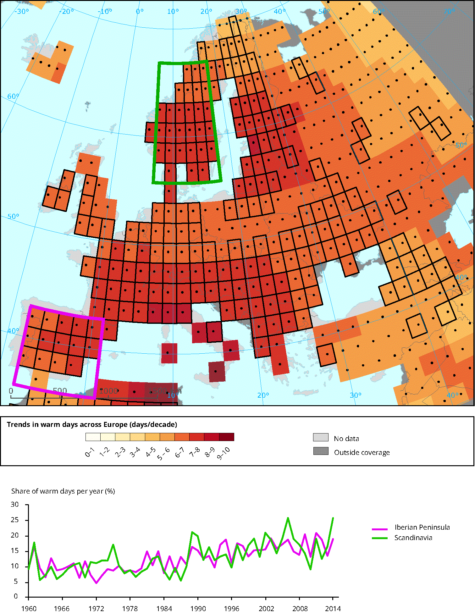 How to read the map: Warm days are defined as being above the 90th percentile of the daily maximum temperature. Grid boxes outlined in solid black contain at least 3 stations and so are likely to be more representative of the grid-box. Higher confidence in the long-term trend is shown by a black dot.