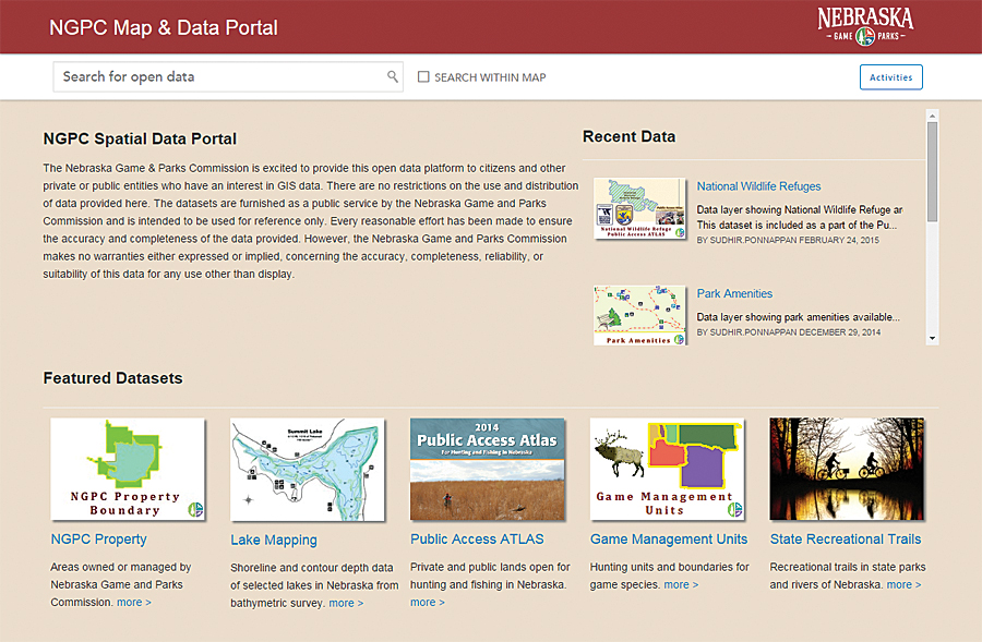 The Nebraska Game and Parks Commission uses its open data portal to share data about the state's fish, wildlife, park, and outdoor recreation areas. Its datasets are crafted to be authoritative, informative, and user-friendly. This open data site is a great resource for the public to find answers to common questions or to access data for geospatial analysis and application development.